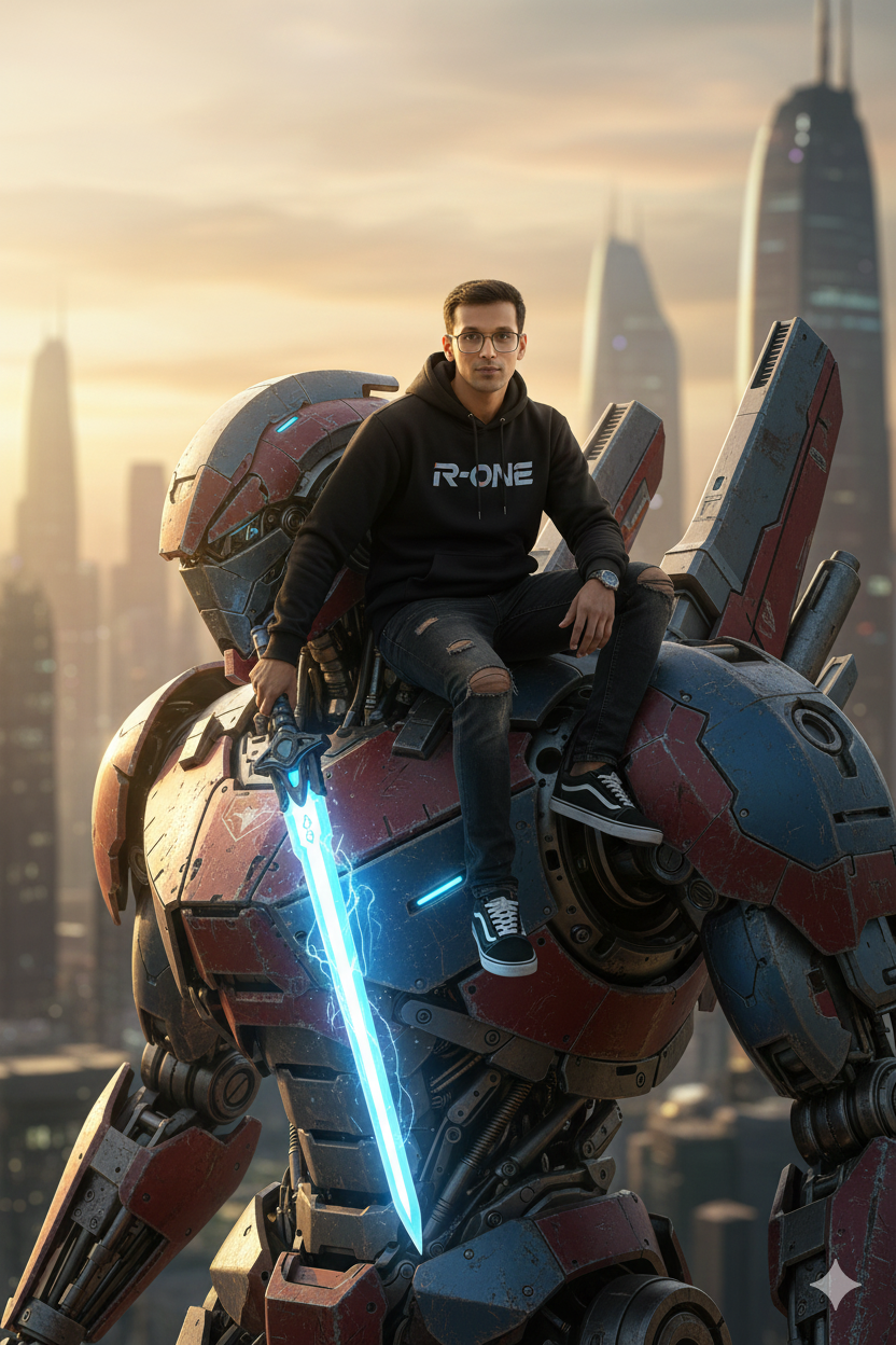 Take this photo without changing the face at all. A medium close-up shot from about 1–2 meters away shows a man sitting casually on the shoulder of a massive, highly detailed, futuristic mecha-style robot, with textured metal surfaces, slightly worn red-and-blue paint, and exposed mechanical panels revealing internal components. The man is wearing a black hoodie with the word "R-ONE" written on it, ripped jeans, and black-and-white skate shoes. He holds a blue, glowing energy sword that emits subtle flashes of light. The background is a futuristic metropolis with sleek skyscrapers, the warm golden tones of the low sunset. The soft, warm sunset lighting creates subtle reflections on the robot's metal surfaces and casts light gradients on the man's face without harsh shadows. The overall feel is epic, heroic, and cinematic, with high yet natural contrast. A medium depth of field keeps the robot and man in sharp focus, while the city buildings in the background are slightly blurred (subtle bokeh). Colors appear realistic, texture details are very clear, and the city atmosphere is filled with a thin twilight haze, adding to the sense of grand scale and drama.