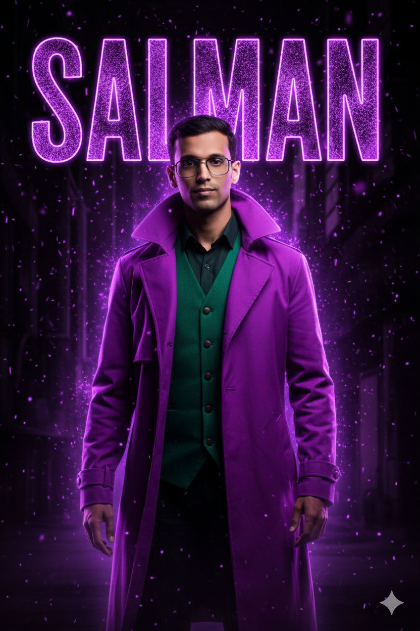 A young man,(use uploaded photo) standing dramatically, facing the viewer, wearing a purple trench coat and green waistcoat, illuminated by vibrant purple neon light. Large, grunge-textured purple text 'SALMAN' vertically centered behind him. Dark, cinematic background with small, sparkling purple particles falling around him. Highly detailed, photorealistic, dark fantasy, 8K resolution, vertical composition.