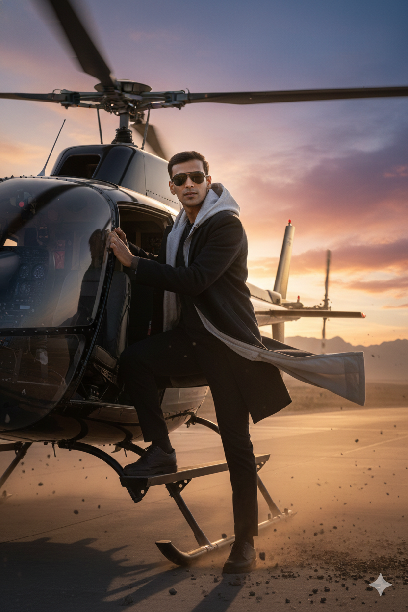 A cinematic, ultra-realistic image of a confident South Asian man, around 30 years old, with the same face and hairstyle as the uploaded image, entering a powerful helicopter on a windswept airstrip during golden hour. He is wearing a dark-colored coat layered with a light grey techwear jacket that billows dramatically in the rotor wash from the spinning blades. One foot is firmly placed on the boarding ramp, while one hand grips the edge of the hatch. He wears black sunglasses that reflect the