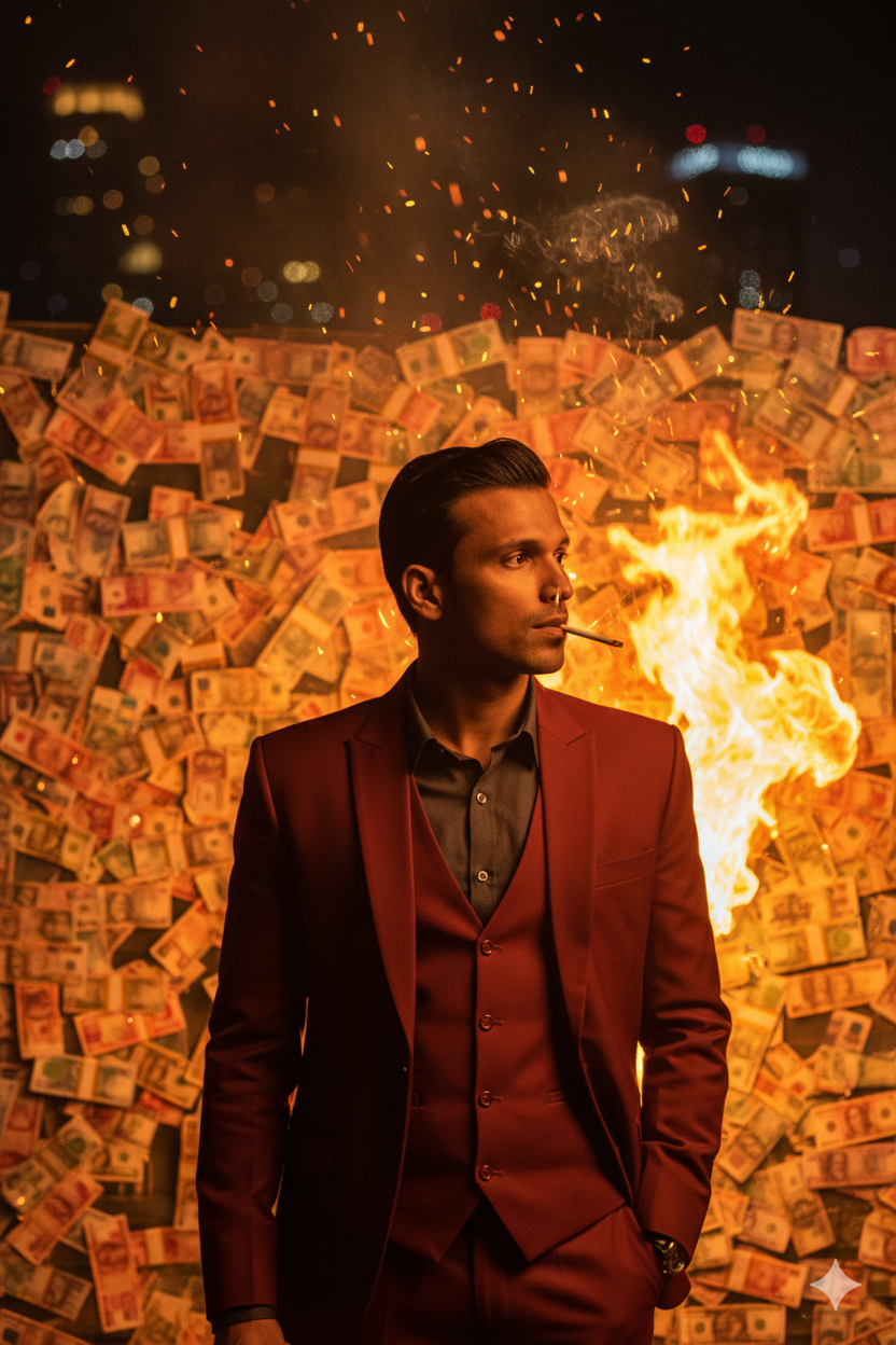 Create this photo without altering the face at all. Close-up medium shot (approximately 1.5–2 meters away) of a man wearing a dark red suit with an orange vest and a dark shirt. He stands casually smoking, his body slightly turned to the side but his face turned to the left side of the frame. Behind him is a large stack of banknotes, arranged like a wall or pyramid, burning with a large flame. The flames spread intensely, producing sparks and fine embers that fly through the air. The lighting comes from the fire as the primary light source, casting a golden rim light on the sides of the man's face and hair, highlighting the texture of his makeup and the details of his suit. The shadows on the parts of his body not exposed to the fire are soft yet contrasting. The background appears to be a nighttime city, with the faint bokeh of building lights and slight blurring, providing a sense of depth. The atmosphere feels dramatic, intense, anarchic, and tense, with a cinematic feel reminiscent of a psychological crime film. The rendering is highly realistic, with high texture detail, the warm colors of the fire blending with the dark tones of the shadows, and the atmosphere is filled with thin smoke and sparks.