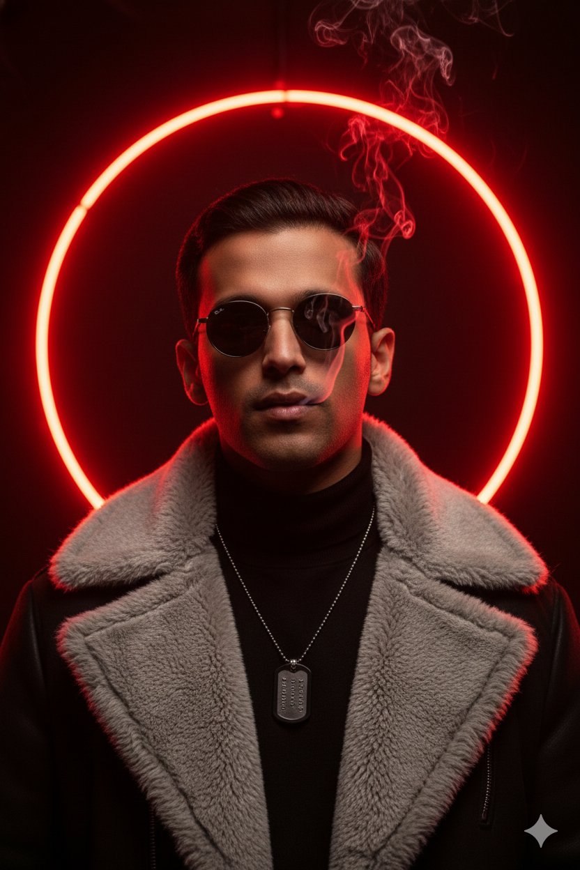 Take this photo without changing the face at all. Close-up portrait shot of a charismatic man, photographed from a distance of approximately 0.8–1 meter. The man wears round sunglasses, his hair neatly slicked back, and a thick black coat with a light gray synthetic fur collar, paired with a black turtleneck and a metallic dog tag necklace hanging from his chest. The background is a perfect circle of neon red light shining brightly behind the subject's head, creating a glowing aura. Thin cigarette smoke appears to be escaping from his mouth, drifting gently into the air, adding a dramatic touch. The lighting is predominantly neon red from behind (backlighting), with a hint of soft light from the front to highlight the contours of the face and skin texture. The image is dark, intense, and cinematic in style, with a mysterious and modern feel. The color tones tend to be warm with a strong red saturation, creating an urban, edgy, and elegant mood
