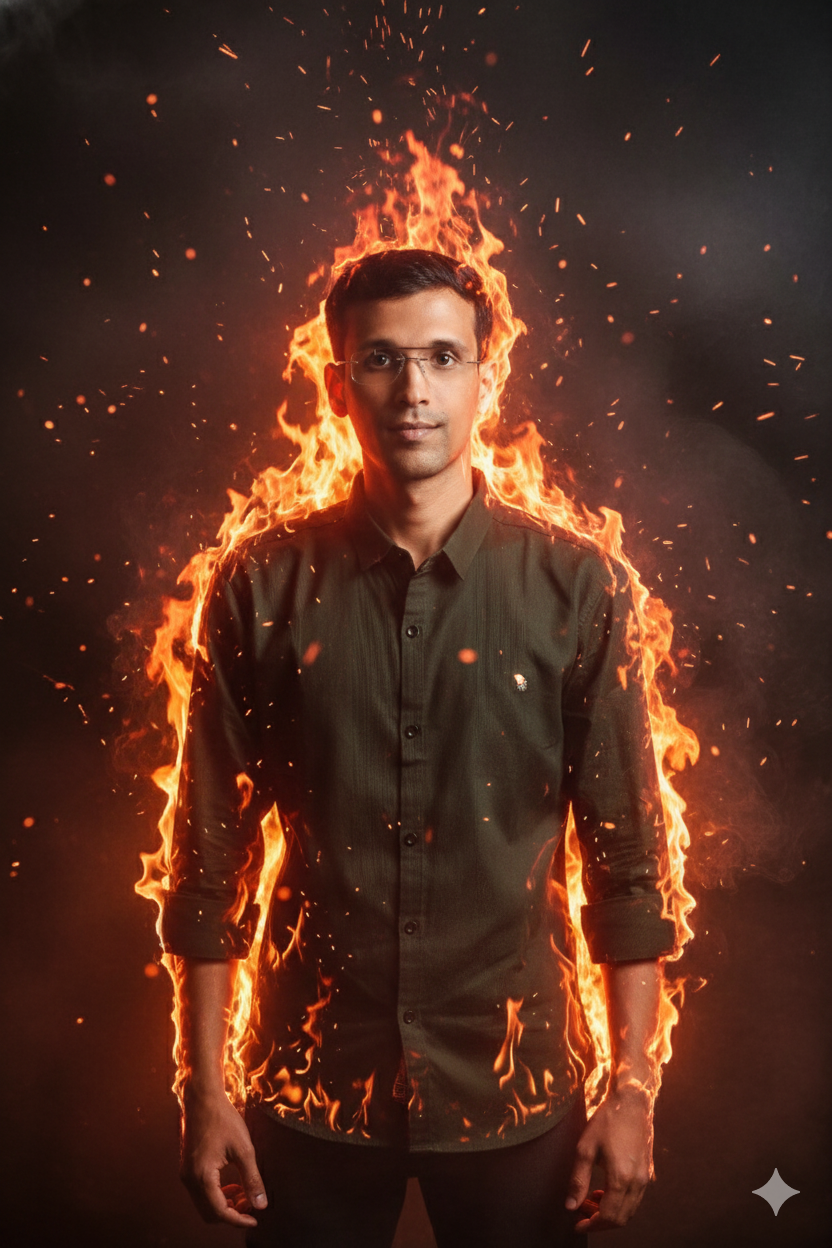 A dramatic portrait of a young man standing confidently surrounded by intense flames. The background is a dark, smoky studio environment, glowing from the fire light. His body is slightly highlighted with orange and red reflections from the flames. Sparks and embers float around him. The fire looks realistic and powerful, giving a heroic cinematic look. Ultra-detailed lighting, high resolution, realistic skin texture, fire VFX, dramatic atmosphere, moody shadows.